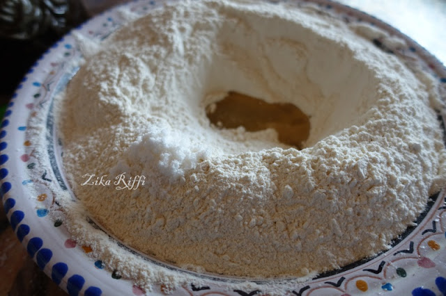 ajouter de l'eau tiède progressivement en incorporant la farine jusqu'à obtention d'une pâte molle et assez collante